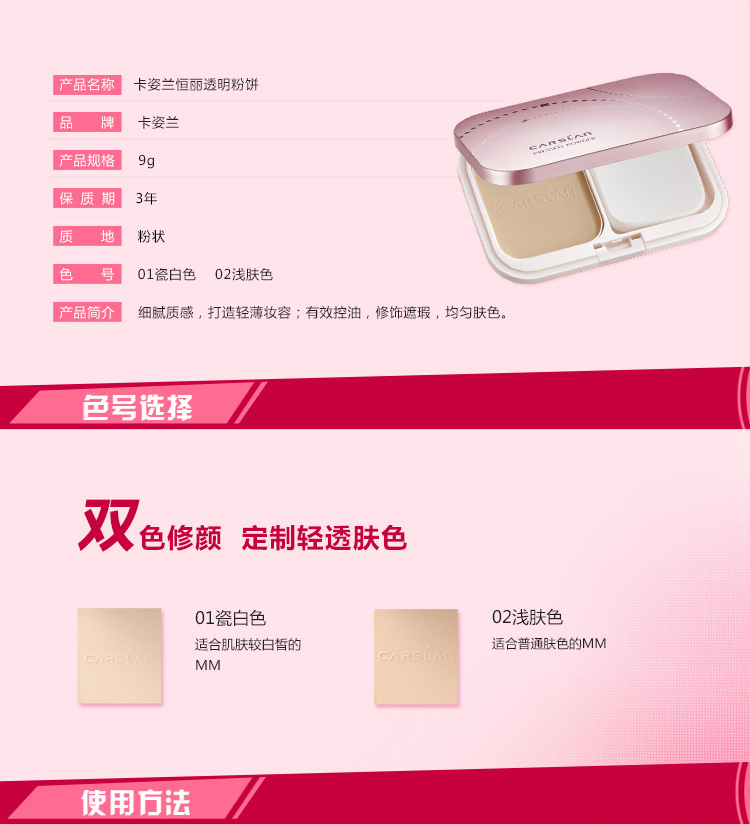 卡姿兰(Carslan)恒丽透明粉饼02#浅肤色9g(裸妆 遮瑕 控油 持久 定妆)